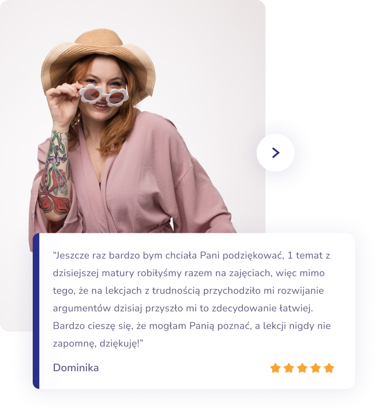 Najsłynniejsza „Baba od polskiego” w Polsce – polonistka i podcasterka, której treści edukacyjne na Facebooku, Instagramie, YouTube i TikToku docierają do milionów osób. Autorka bestsellerowych kursów, które pomogły tysiącom ósmoklasistów osiągnąć wymarzony wynik na egzaminie.