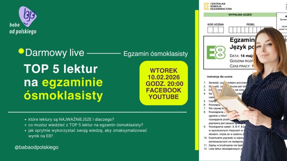 Porozmawiajmy o pięciu najważniejszych lekturach na egzamin ósmoklasisty z języka polskiego! Zapraszam na live, w trakcie którego zajmiemy się tym, co najważniejsze z najczęściej pojawiających się lektur na egzaminie ósmoklasisty z języka polskiego.